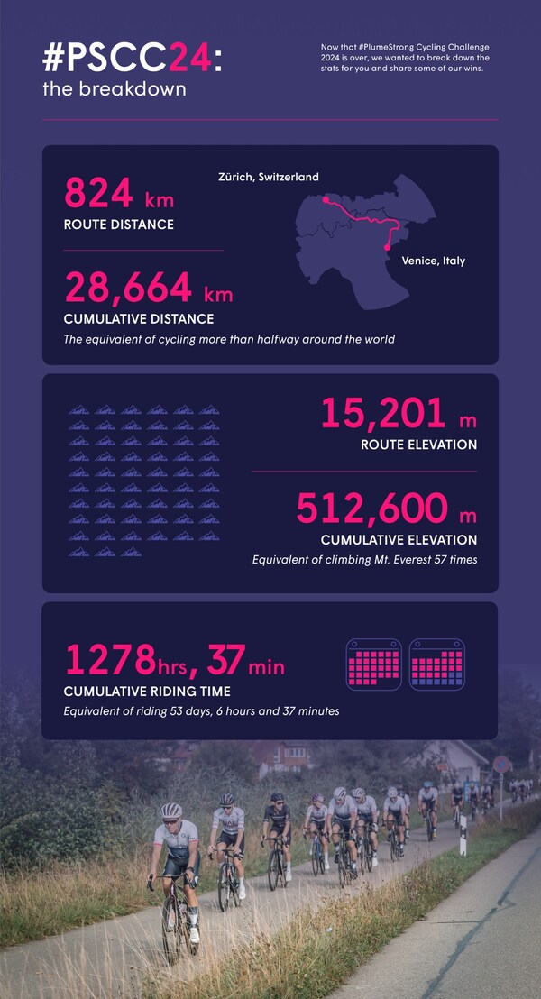 PALO ALTO,Calif.,Sept. 23,2024 -- Plume completed its fourth annual #PlumeStrong Cycling Challenge (#PSCC24) – a 5-stage 824 km route from Zurich,Switzerland to Venice,Italy that took place from September 2-6,2024. The #PSCC is a fundraiser to benefit #PlumeStrong,Plume's social impact initiative with a mission to empower communities worldwide through meaningful initiatives that promote health,education,equality,efficiency,sustainability,technological innovation,and security. #PlumeStrong envisions a world where more individuals,particularly children,have access to education,resources,and opportunities.