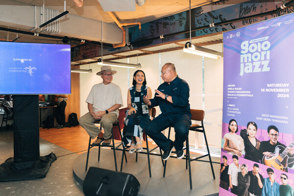 from left to right: Bagas Indyatmono (ceo of Jazz Gunung Indonesia),Andien (singer / line up of International Golo Mori Jazz),Troy Warokka (Commercial Director of InJourney Tourism Development Corporation-ITDC) at the press conference road to International Golo Mori Jazz which held in Kuta,Bali,25 October 2024. They aim to promote local tourism,and contribute to economic growth.