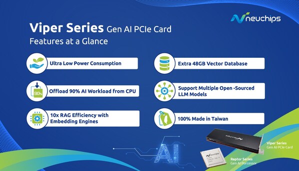 TAIPEI,May 28,2024 -- Neuchips,a leading Artificial Intelligence (AI) Application-Specific Integrated Circuits (ASIC) provider,will be launching its latest product,the Viper GenAI PCIe Card,at COMPUTEX 2024. The plug-and-play enterprise GenAI solution allows for a frictionless upgrade from traditional PCs to AI-enabled systems,empowering enterprises to unlock AI's full potential.