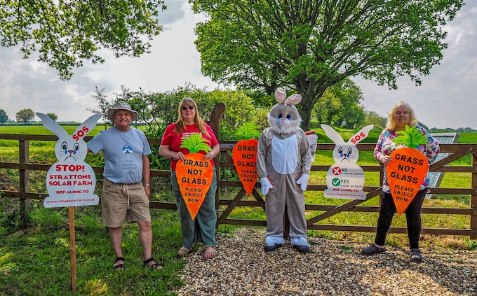 To protest the development,campaigners dressed up as bunnies and lay under solar panels near placards reading “Grass not Glass” and “This is not in keeping with this beautiful countryside”.