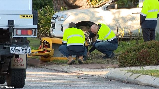 The man's colleague is seen rushing across the road to help before the 22-year-old was rushed to Royal Perth Hospital with a broken arm.