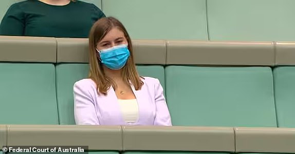 (Pictured below: Brittany Higgins in Parliament House,watching Scott Morrison's apology in 2022)