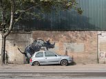 Banksy unveils EIGHTH animal-themed artwork in as many days: Mural of a rhino mounting a Nissan Micra with a traffic cone on its bonnet appears in south east London