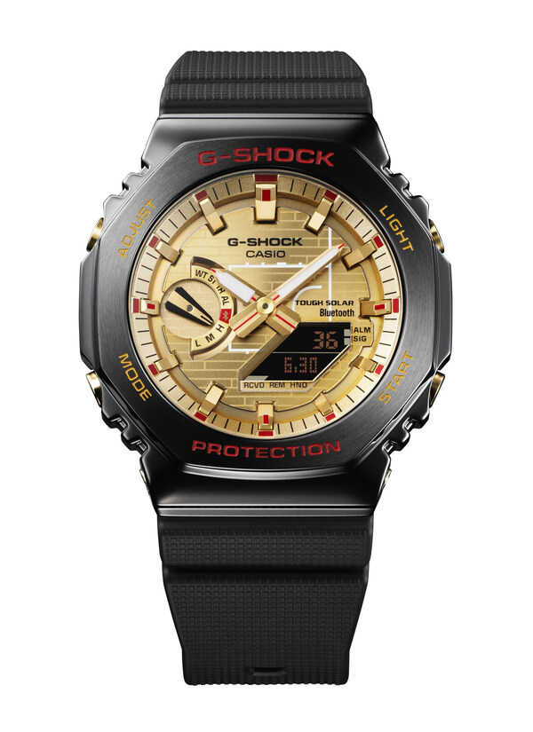 The GBM-2100RH is the first of theRui Hachimura signature models to be based on the GBM-2100,a shock-resistant timepiece featuring an octagonal metal bezel that is equipped with Smartphone Link and the Tough Solar charging system. Taking inspiration from a basketballcourt,the gold-toned dial employs a wood pattern in transparent printing that evokes the hardwood floor of the basketball court,with the area beneath the basket — where Hachimura really shines — marked in white. The LCD captures the look of the shot clock counting down the seconds. The symbol 八(hachi in Japanese,meaning "eight"),representing his name,is engraved at the eight o'clock position,adding a unique,personal touch.Hachimura's signature "Black Samurai" logo,which combines 八 witha Japanese swordto form the"H" in"Hachimura," is engraved on the band loop and incorporated into the packaging design.His signature is also engraved on the case back.