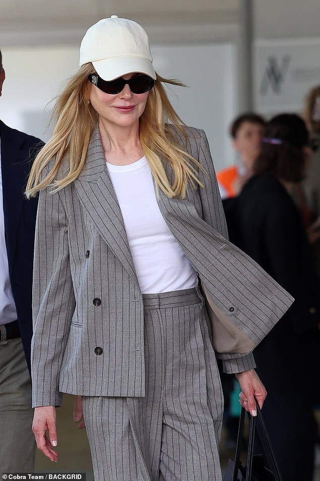 She wore a smart light grey suit which she teamed with a plane white T-shirt,cap and dark shades.