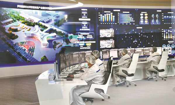 Staff members of the Yili Group,a major dairy producer,monitor production of a dairy factory in real-time at a digital center in Hohhot,Inner Mongolia,in 2022. [Photo provided to China Daily]
