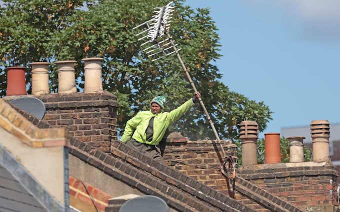 At least 16 police officers with riot shields and helmets were in a stand-off with a man who appeared to be throwing chimney pots and aerials from a roof in west London on Monday.
