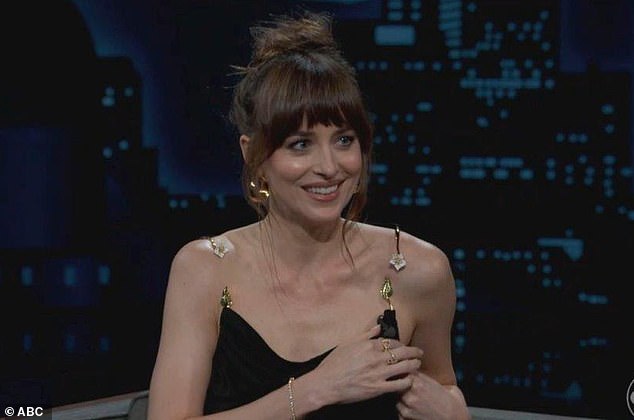 The 34-year-old actress while wearing a black dress with thin straps clutched her left shoulder area after Jimmy,56,played a clip from Daddio showing Dakota opposite co-star Sean Penn,63.