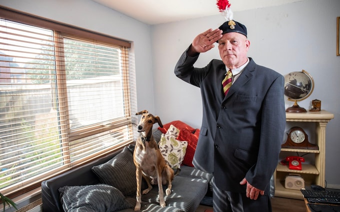 Stephen Close salutes at his Manchester home after his military cap and ceremonial badge were returned to him by the Royal Fusiliers