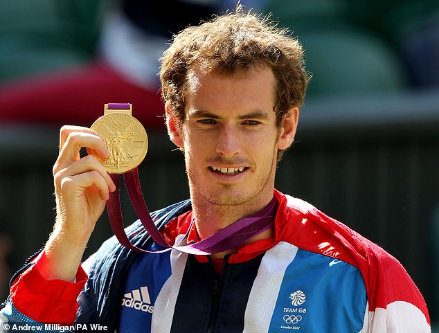 Sir Andy Murray pictured with his gold medal after beating Switzerland's Roger Federer in the final at Wimbledon,London,in 2012