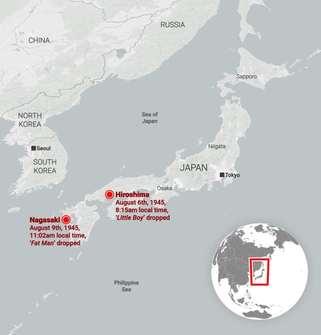 The bombs were dropped three days apart (Map: Metro)Towards the end of the Second World War,the United States was desperate to end the conflict by whatever means necessary. Their solution was to drop two nuclear bombs,never before used in human history,on Nagasaki and Hiroshima.Both cities were vital points for military and industrial reasons – striking them would bring Japan to its knees,Americans hoped,forcing it to surrender and end the war.The bombs did end the war,but their use has been questioned ever since. Was it necessary to kill that many people and use a weapon of mass destruction? He added: ‘Having been directly exposed to the heat rays,they were covered with blisters,the size of balls,on their backs,their faces,their shoulders and their arms. The blisters were starting to burst open,and their skin hung down like rugs. Some of the children even have burns on the soles of their feet. They’d lost their shoes and run barefoot through the burning fire.’70,000 were killed instantly in Hiroshima. By the end of the year,more than 150,000 deaths were recorded in total from radiation poisoning and injuries.Fujio Torikoshi was just over a mile away from the blast,eating breakfast with his mum,when he heard a plane. He wandered outside to look but saw nothing.