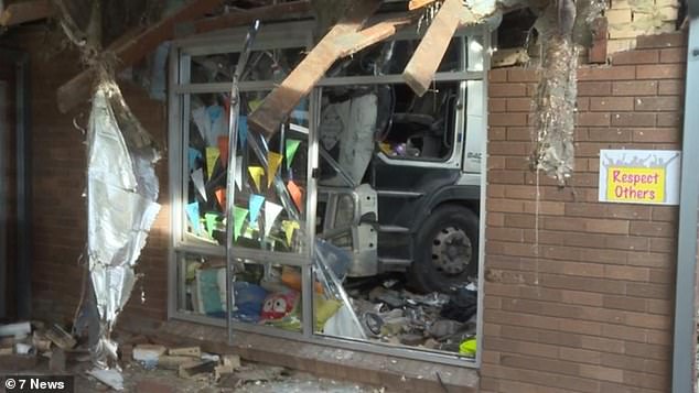 'He's gone off the road,crashed into the gate at the local church and then finished underneath a classroom at the school,' Sergeant Shaun Colls told 7News.