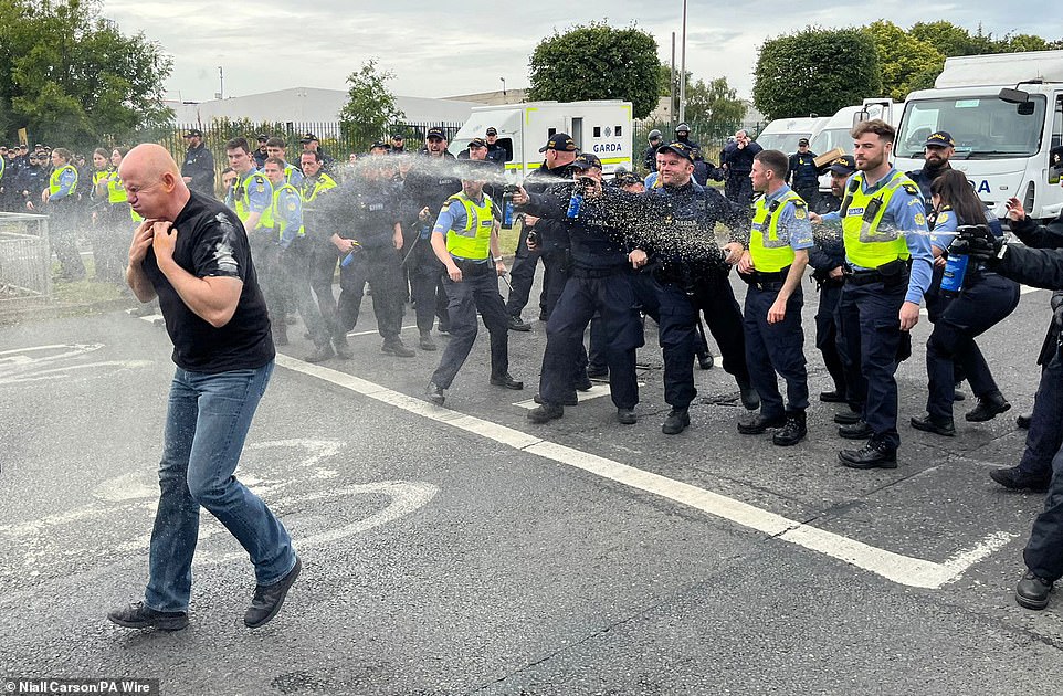 Protesters hurled bricks and fireworks at riot police near a Dublin factory set to house asylum seekers today, with officers spraying activists with pepper spray.