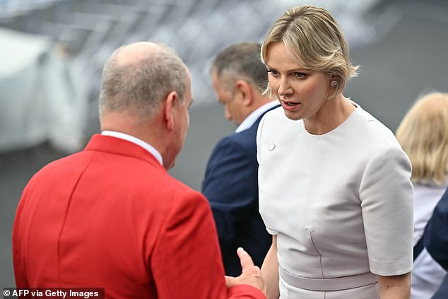 Some images from the event show the royal appearing pensive while watching from the stands,meanwhile another snap shows Charlene speaking with her husband,with a serious expression on her face.
