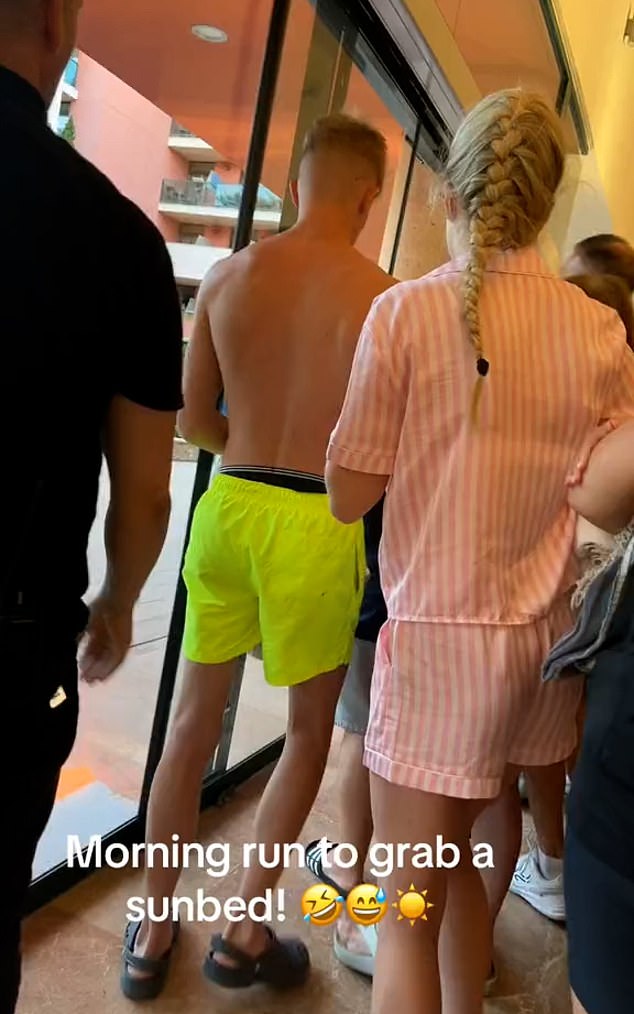 Armed with towels in hand,these UK tourists can be seen queuing around the corner to the pool's entrance ready to dash out as soon as doors are opened by staff first thing in the morning.
