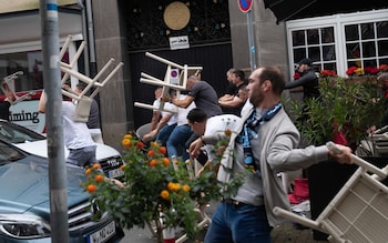 At least seven people were arrested after hooligans fought and threw bottles and furniture outside of a steak restaurant before the fray was broken up by hundreds of riot police.