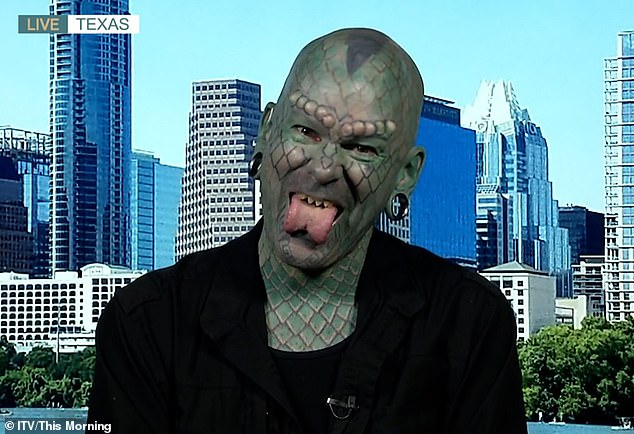 Erik Sprague,from Texas,who is also known as Lizard Man,joined Dermot O'Leary and Alison Hammond on This Morning to speak about his transformation,saying he got his tongue surgically forked in the 90's.