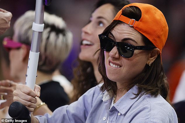 Plaza could be seen holding crutches as she sat courtside with sports power couple Megan Rapinoe and Sue Bird.