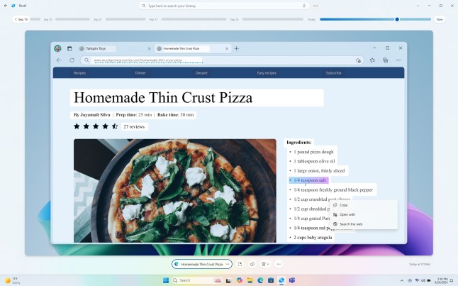 An example Microsoft gave is: ‘Maybe you wanted to make that pizza recipe you saw earlier today but you don’t remember where you saw it. Typing thin crust pizza into the search box would easily find the recipe again. You could also search for pizza if you didn’t remember the specific type of pizza.’