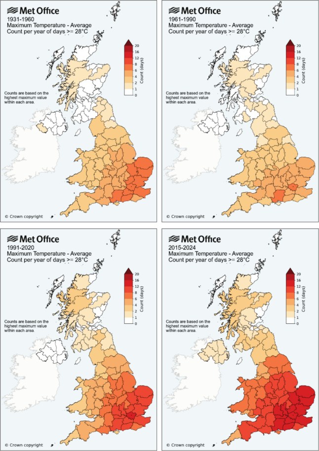 Average count of the number of days annually in which the highest maximum temperature exceeded 28C (Picture: Met Office)