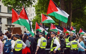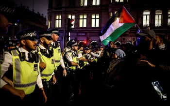 Metropolitan Police officers face pro-Palestine supporters at a rally in central London