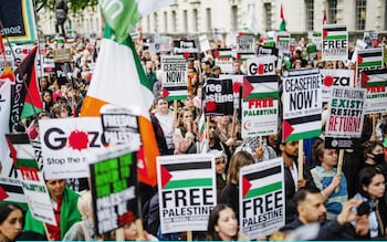Pro-Palestinian supporters gather outside Downing Street in central London on Tuesday