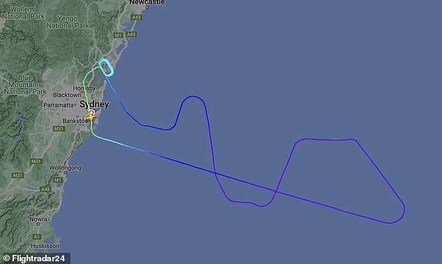 Data from a flight tracker shows that the Boeing 737 travelled over the Tasman Sea before making a U-turn and returning to Sydney airport.