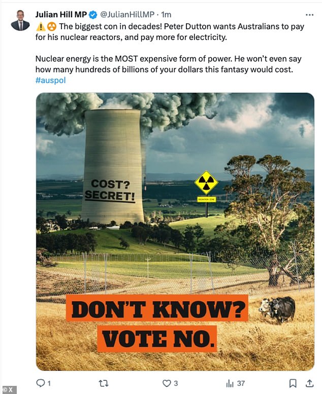 Labor's Julian Hill became the first Labor MP to utilise Mr Dutton's famous phrase,sharing a picture of a nuclear reactor overlaid with the message,'don't know? Vote no'.