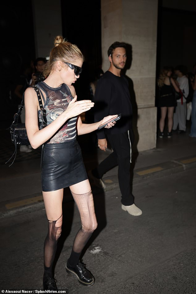 She added to her look with a skintight sheer top that flashed her bra,while she accessorised with a small black handbag and shades.