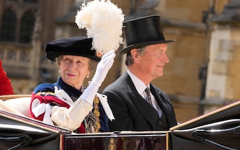 Princess Anne with Vice Admiral Sir Tim Laurence,her husband,in a carriage after attending the Order of the Garter service at Windsor Castle on June 17