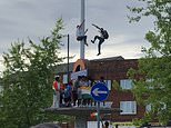Shocking moment Indian cricket fan falls off pole while trying to tie a flag to the top and another man is detained by police as T20 World Cup celebrations in London turn sour
