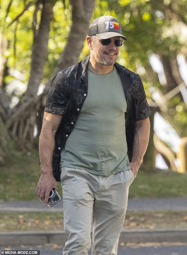 US superstar Matt Damon looked to be in good spirits on Saturday when he was spotted enjoying a stroll through Byron Bay,NSW with his wife Luciana and close friend Lauren Phillips.