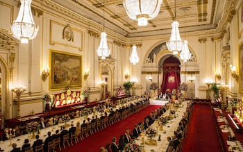 The King and Queen will entertain Emperor Naruhito and his wife,in the ballroom at Buckingham Palace