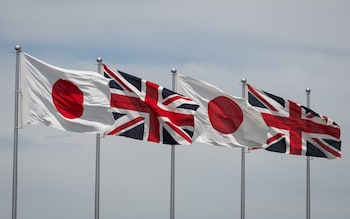 National flags of Japan and Britain at Haneda airport in Tokyo before the Emperor and Empress departed for Britain