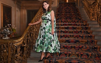 The 38-year-old,wearing a green and white floral dress cradled her bump with two hands while posing for photographs at the country estate on Wednesday.