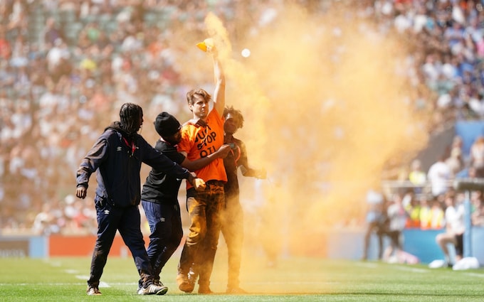 The two protesters threw orange cornstarch powder paint after invading the pitch during the Gallagher Premiership Rugby final in May 2023.