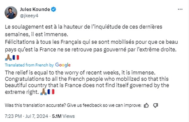 Several members of France's Euro 2024 squad have been celebrating 'the people's victory' and have expressed their 'relief' after Marine Le Pen's far-right party,National Rally,suffered defeat in the country's snap election on Sunday.
