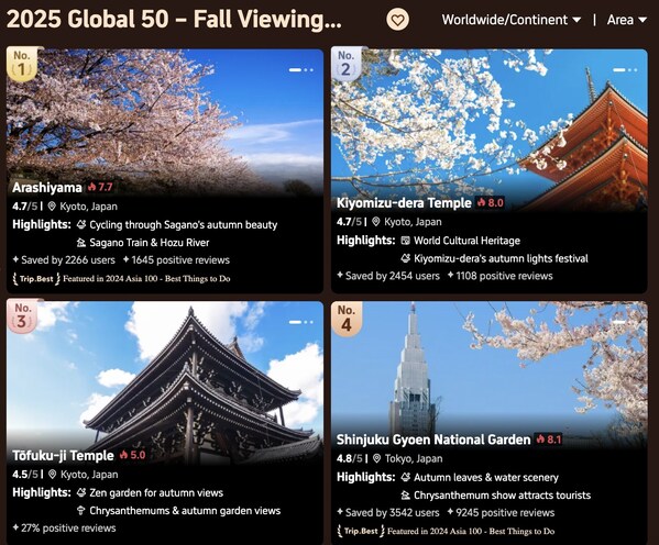 Travellers will also find fresh inspiration in two new categories under the Attraction list – Water Fun,highlighting the most loved water parks,beaches and islands,and Fall Views,showcasing the top spots around the globe for autumn foliage vistas. For instance,under the Fall Views category,Japanleads in almost all the top 10 spots with iconic destinations like Arashiyama and Kiyomizu-dera Temple,while China offers picturesque sites such as Jiangxi's Wuyuan Huangling,celebrated for its terraced fields and traditional architecture,and Qixia Mountain in Nanjing,famed for its vibrant red maple forests. Meanwhile,in the Water Fun category,Thailand's Racha Yai Island and Indonesia's Jimbaran Beach are among the top-rated locations for those seeking the ultimate aquatic adventure.