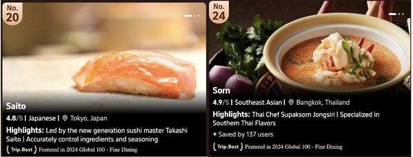 No travel experience is complete without great food,and Trip.Best 2025's restaurant rankingsconfirm the importance of culinary travel. This year's lists – spanning Fine Dining,Local Restaurants,and Restaurants for Views & Experiences – celebrate everything from haute cuisine to beloved local eats. In the Global 100 Fine Dining category,Europe leads the charge with restaurants like Arpège in Paris and Sketch (Lecture Room & Library) in London ranked among the top. Other standouts include Per Se in New York and Le Bernardin,as well as DiverXO in Madrid. Tokyo's Sushi Saito and Bangkok's Sorn show that Asia's culinary scene is gaining ground on the global fine dining stage.
