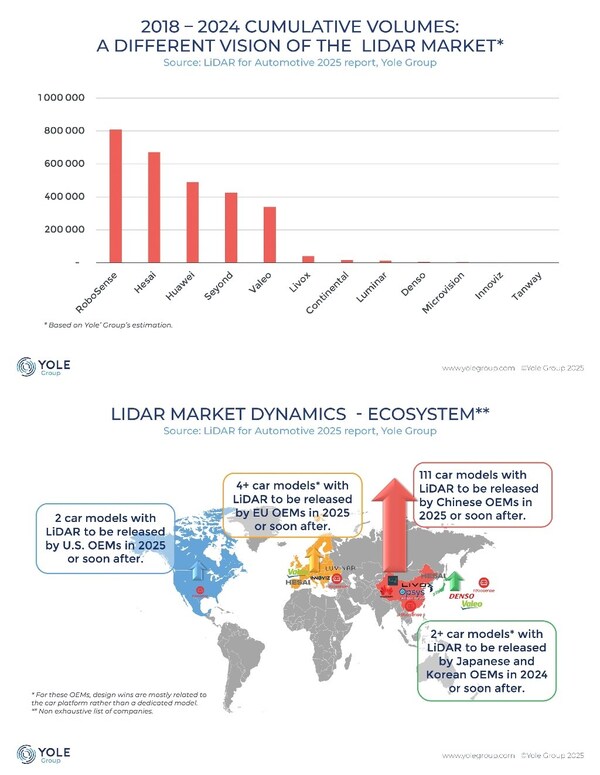 SHENZHEN,China,April 11,2025 -- Recently,Yole Group,an international research institute and market research & strategy consulting company,released the LiDAR for Automotive 2025 report (hereinafter referred to as the "Report"). According to the Report,RoboSense has secured three global No.1 positions in the automotive LiDAR market: No.1 in 2024 global passenger car LiDAR market share,annual sales champion for ADAS LiDAR,and cumulative ADAS sales champion from 2018 to 2024. These achievements further demonstrate RoboSense's leading position and strong capabilities in the global LiDAR industry.
